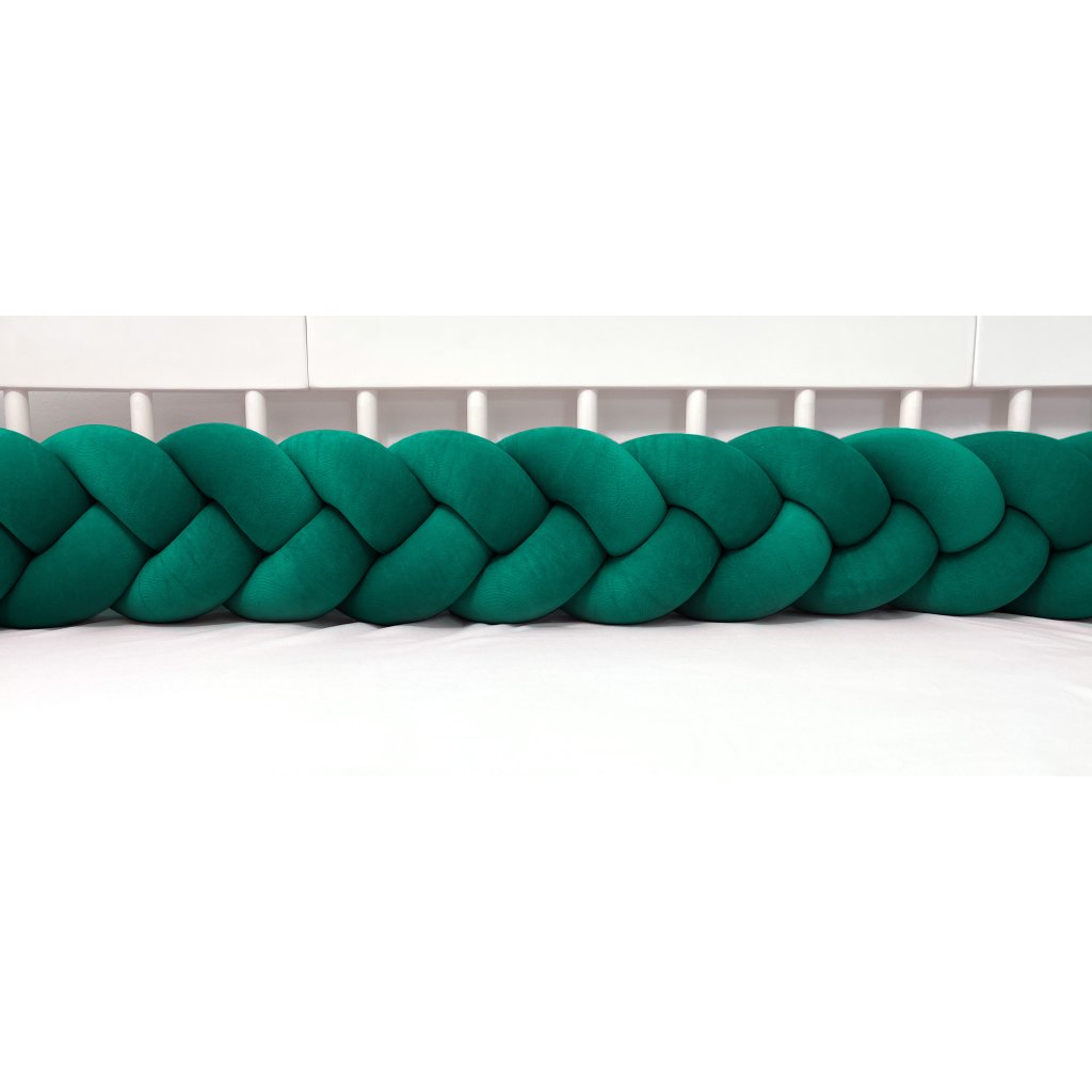 Plyšový ochranný zapletaný mantinel - pletenec trojitý slúži ako ochranca vášho dieťatka v postieľke a zároveň ako štýlový doplnok v detskej izbe. Pletenec má sadu ozdobných stúh na pripevnenie. Výška cca 15 cm, hrúbka cca 6 cm. Mantinel je dostupný v rôznych dĺžkach (od 120 cm do 400 cm). Všetky 3 pramene sú vyrobené z kvalitného Prémium bavlneného velúru (certifikát Oeko Tex Standard 100) a ručne spletené do vrkoča. Záruka najvyššej kvality – 100% Handmade. Farba: zelená, číslo vo vzorkovníku: 20.