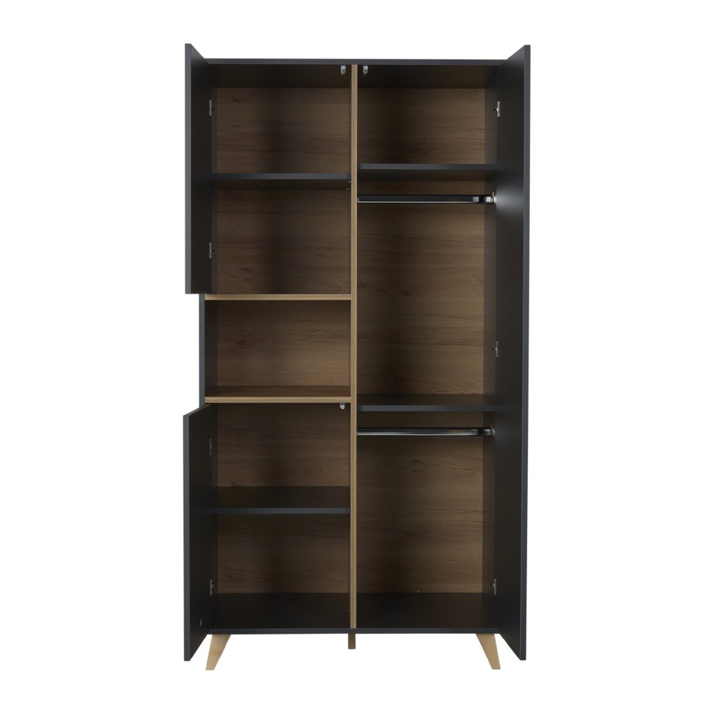 Detská dvojdverová skriňa so škandinávskym nádychom. Disponuje veľkým úložným priestorom, v ktorom uskladníte detské oblečenie alebo zavesíte detské šaty a bundy. Farba skrine je antracitová.