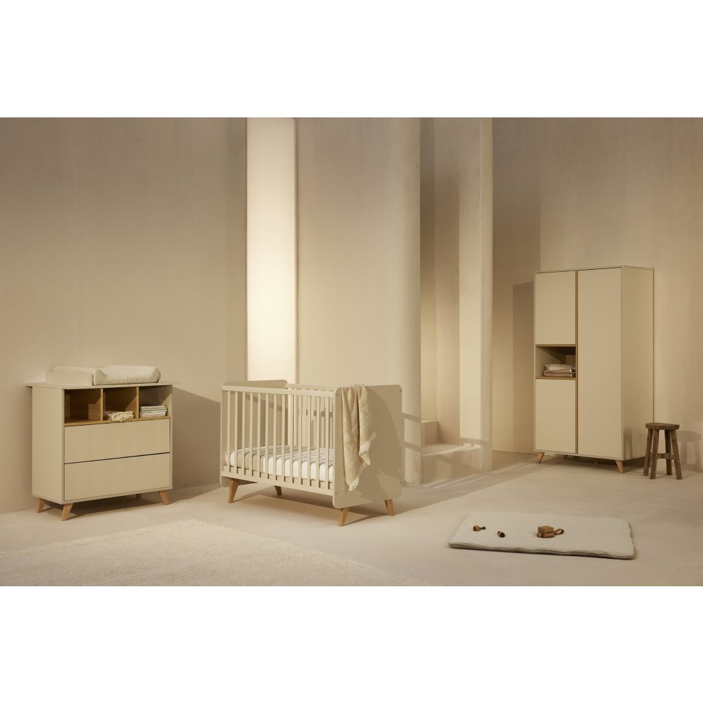 Detská dvojdverová skriňa so škandinávskym nádychom. Disponuje veľkým úložným priestorom, v ktorom uskladníte detské oblečenie alebo zavesíte detské šaty a bundy. Farba skrine je béžová.