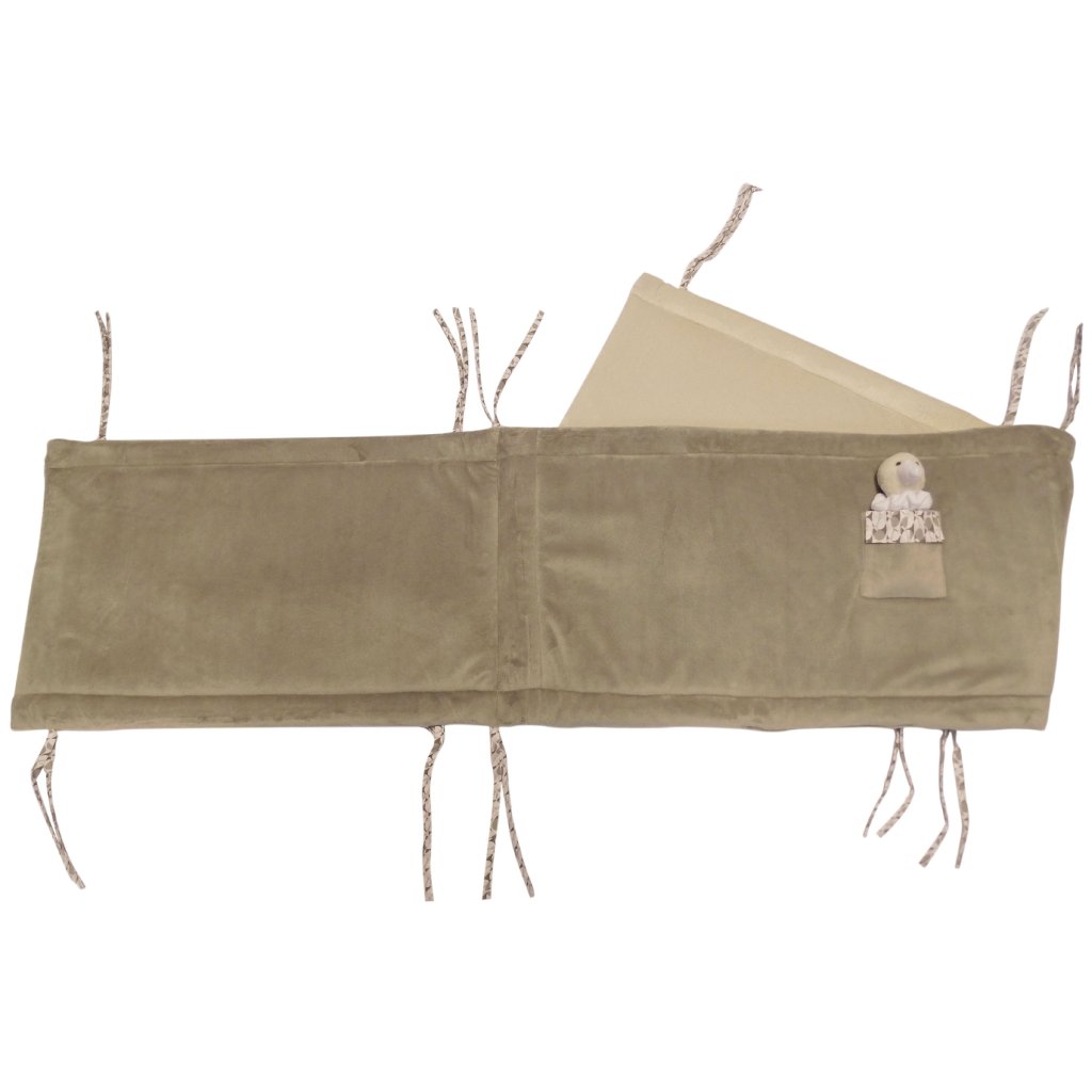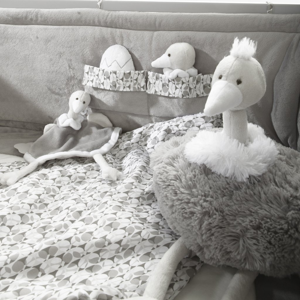 Plyšový mantinel do postieľky 60x120cm s dekoráciou pštrosa Bobo. Snímateľný poťah, certifikát Öko-Tex Standard 100, farba bledošedá