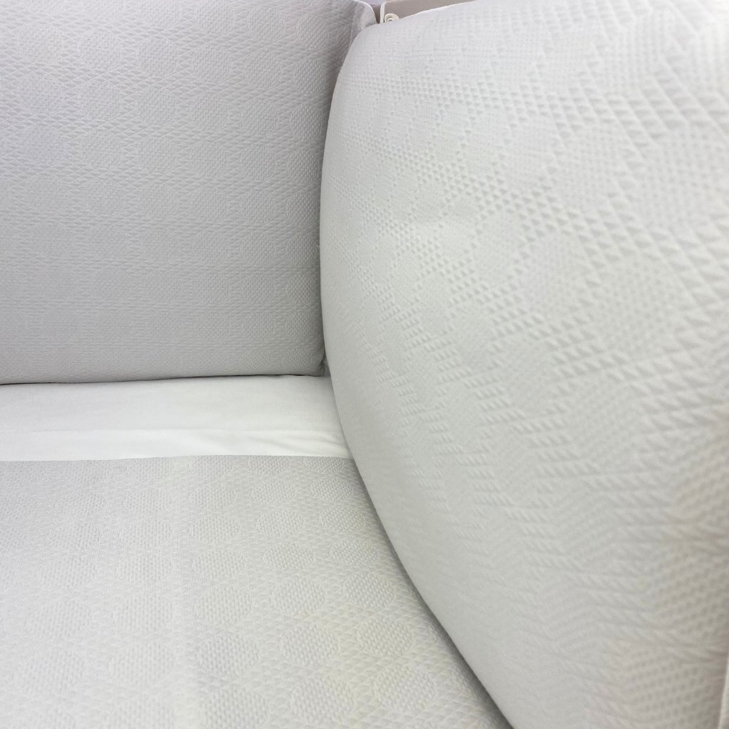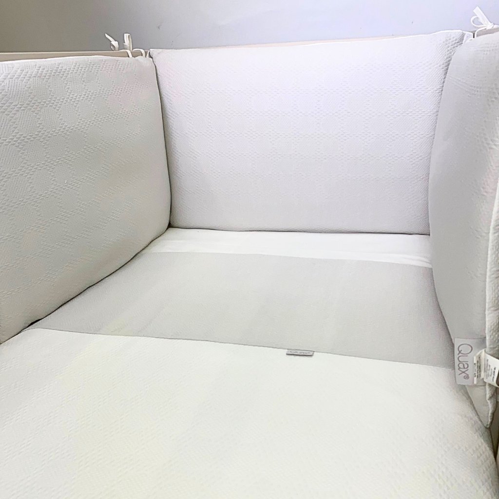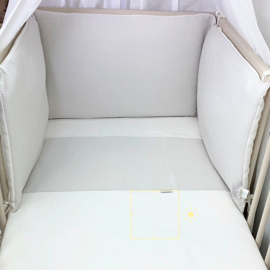 Plyšový obojstranný mantinel do postieľky 60x120cm. Z jednej strany je biely a z druhej strany bledosivý. Snímateľný poťah, certifikát Öko-Tex Standard 100.