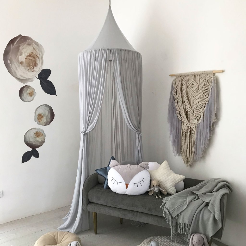 Baldachýn, ktorý má minimalistický dizajn, dodávaný so stuhami vo vnútri a spredu, ktoré môžu zaistiť kolotoče a iné závesné dekorácie.